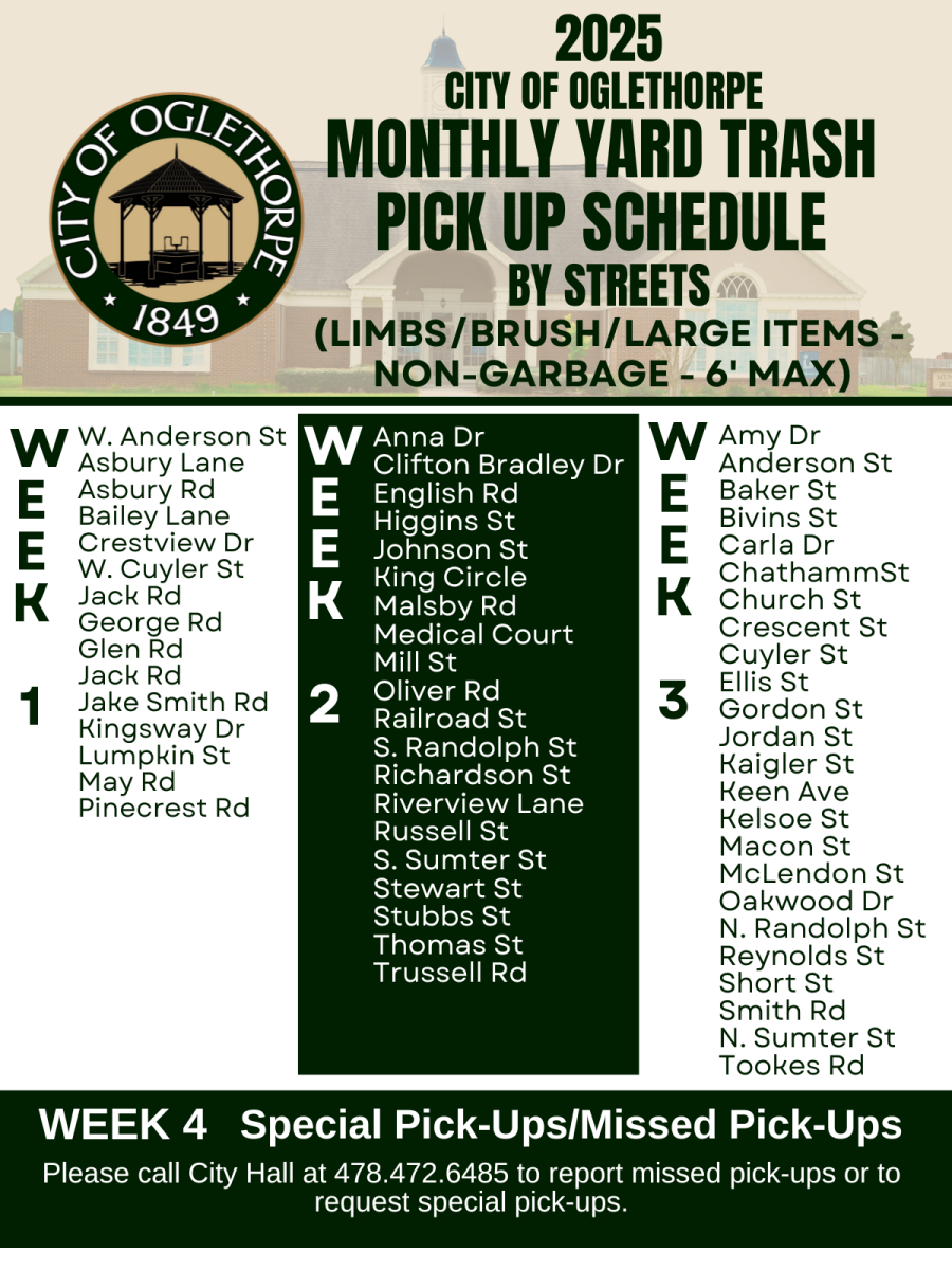 The City of Oglethorpe also provides leaf and limb pickup service. We require all limbs to be cut to 6ft or less in length and all leaves to be bagged. Your location depends on when your items will be picked up. Please see below for Trash Pick Up Schedule.